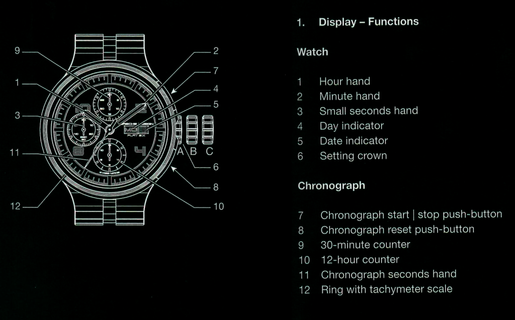 With the tachymeter scale you can measure an average speed over a distance of 1 kilometre. To do so: – Start timing by pressing push-button [7]. – After exactly 1 kilometre, stop timing by pressing push-button [7] again. – The chronograph central seconds hand [11] will indicate the average speed in kmlh on the tachymeter scale [12].