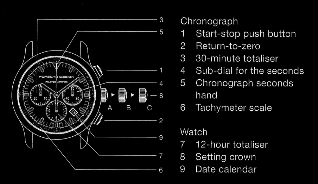 When the push button [1] is pressed, the central chronograph seconds hand [5] starts. It makes one full turn of the dial in 60 seconds. The chronograph minute totaliser [3] records the time, which has elapsed since the start for up to 30 minutes. The 12-hour totaliser [7] records the number of hours [up to 12] since the start.