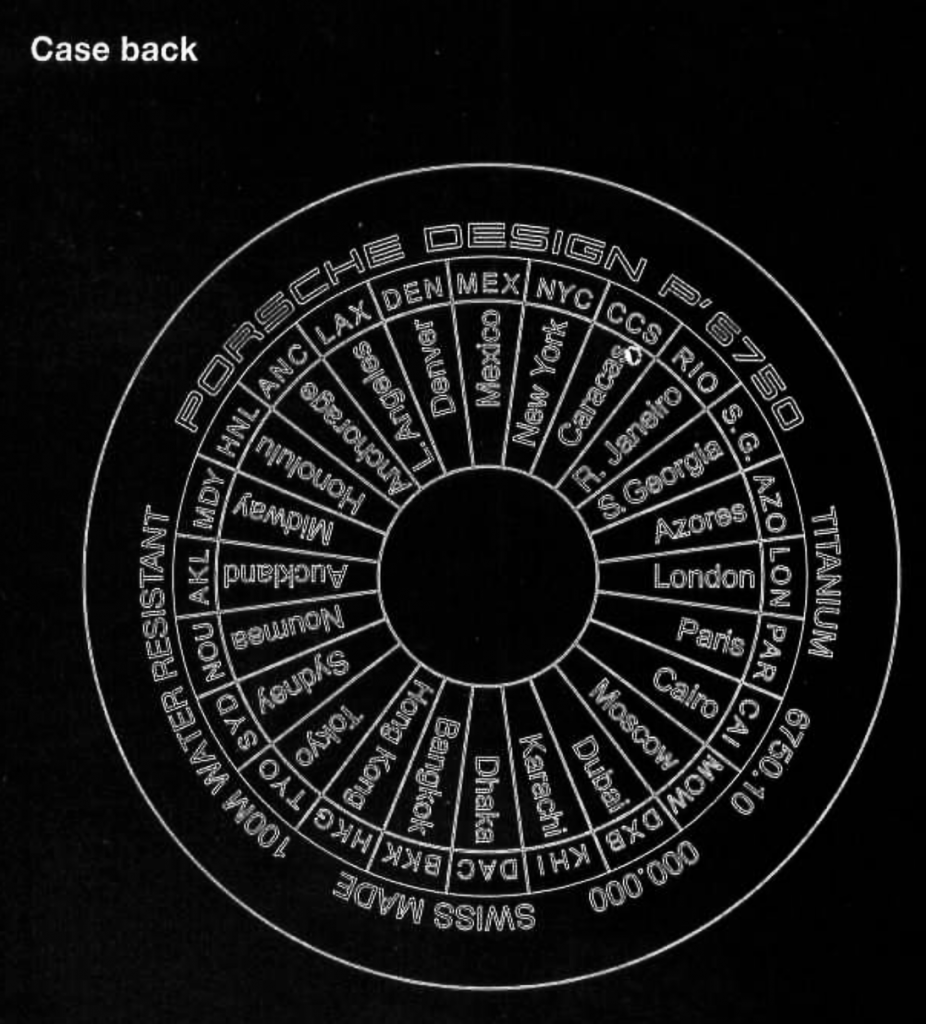 lf you now wish to transfer the time at the reference location to the hands of the dial, push the button [E] on the crown [A]. The hour hand immediately jumps to the hour indicated in the display [D). While changes are being made to the watch’s time zone function, the automatic movement continues to run unimpeded – not one second of the original setting is lost when changing the time zone.
